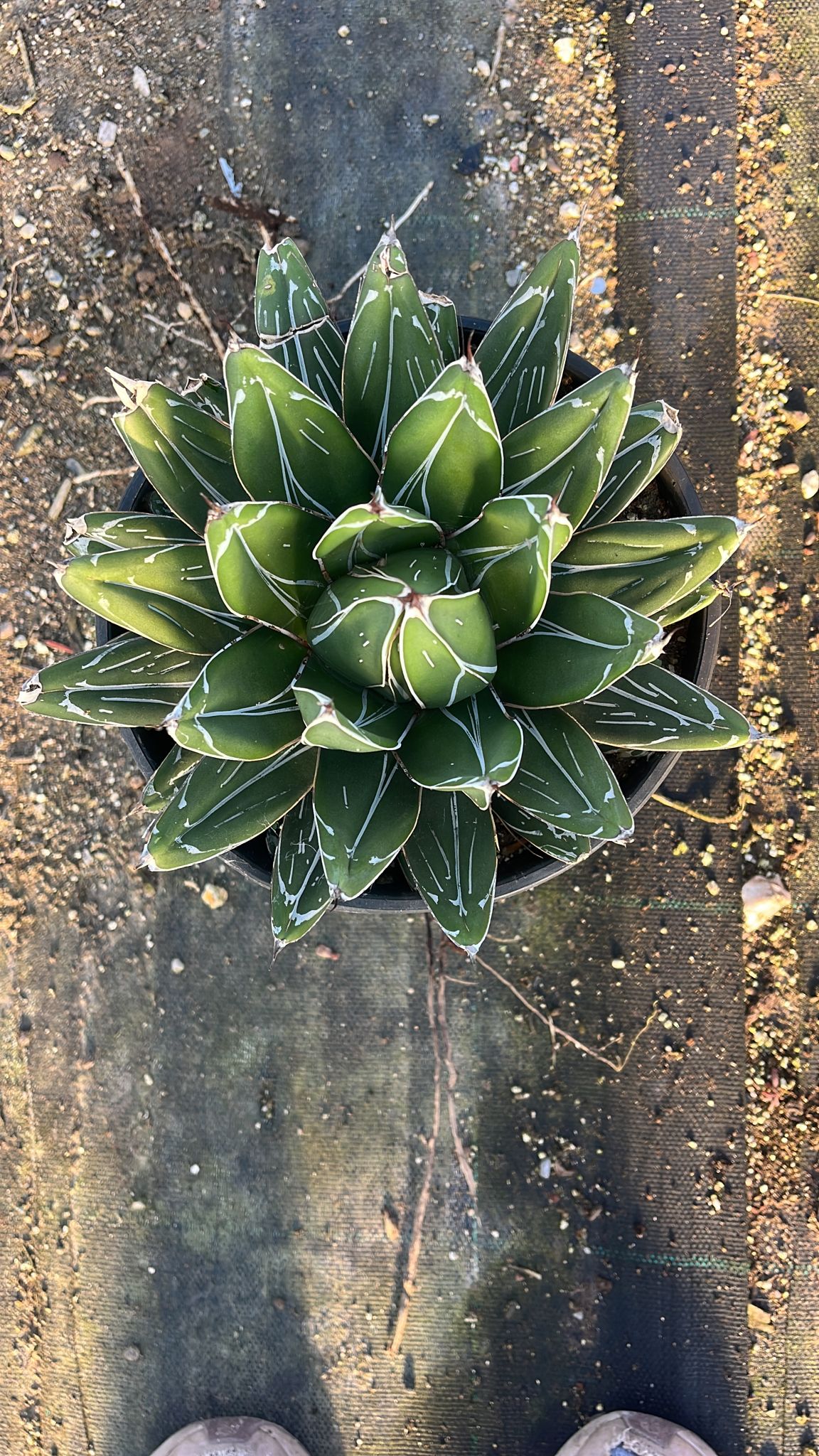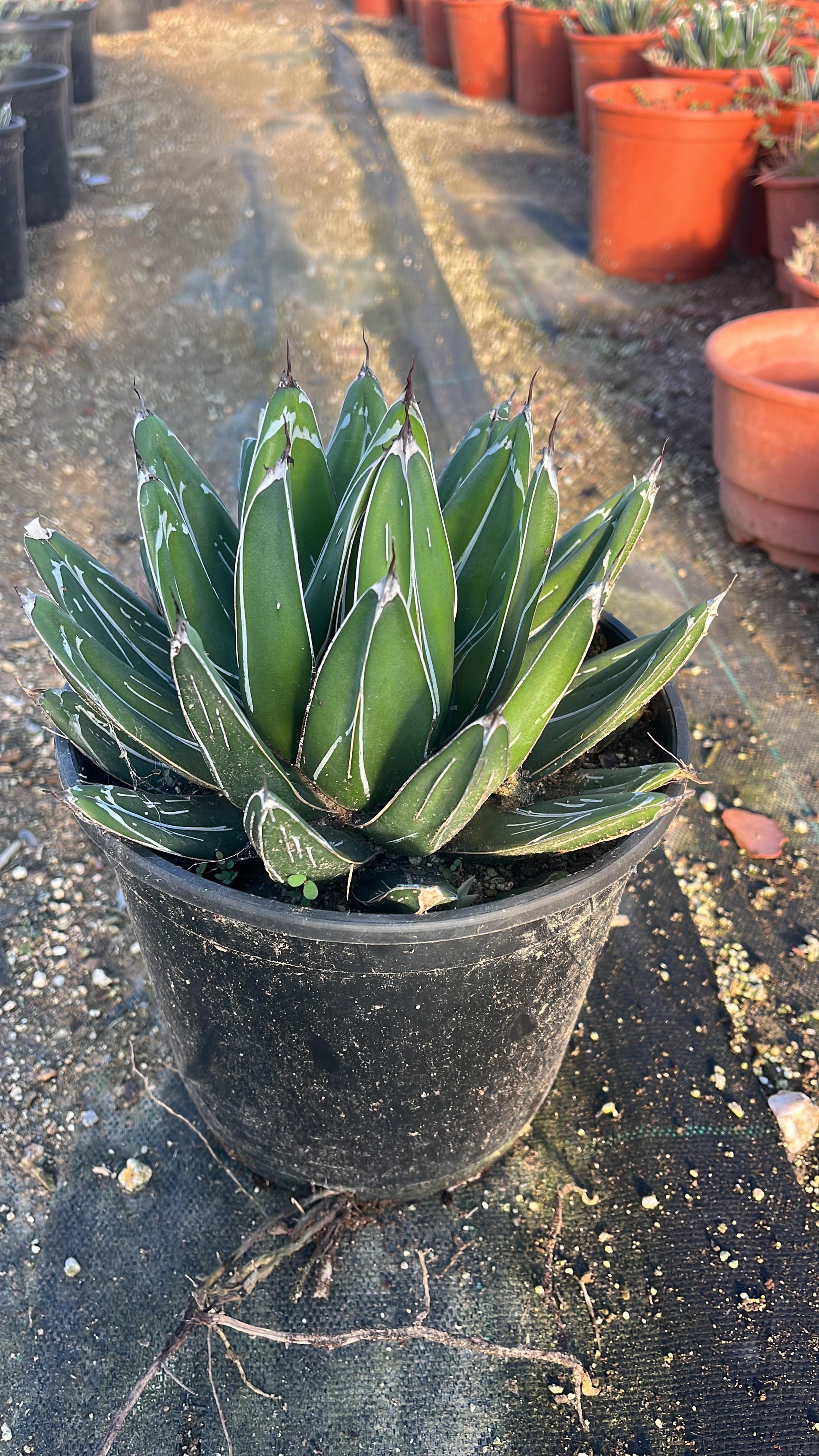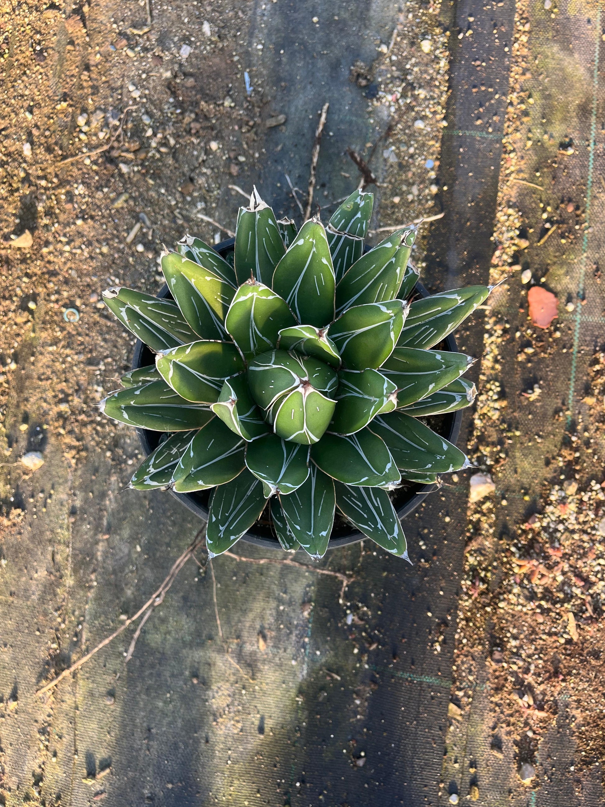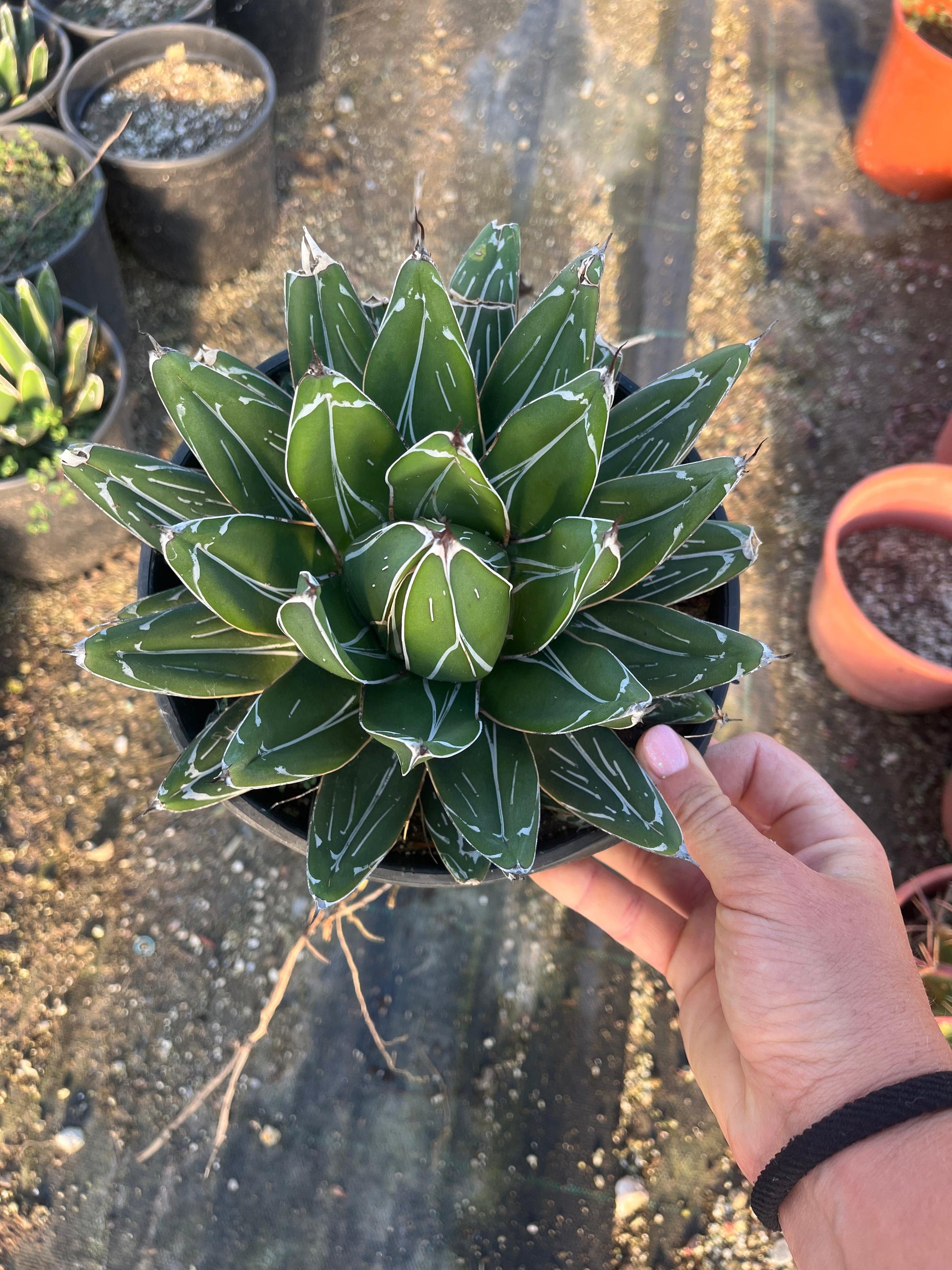 El Agave victoriae-reginae es una suculenta compacta y elegante, famosa por su forma simétrica y sus hojas verdes con líneas blancas naturales. Su crecimiento lento y su resistencia la convierten en una opción ideal para decorar exteriores soleados o interiores bien iluminados.