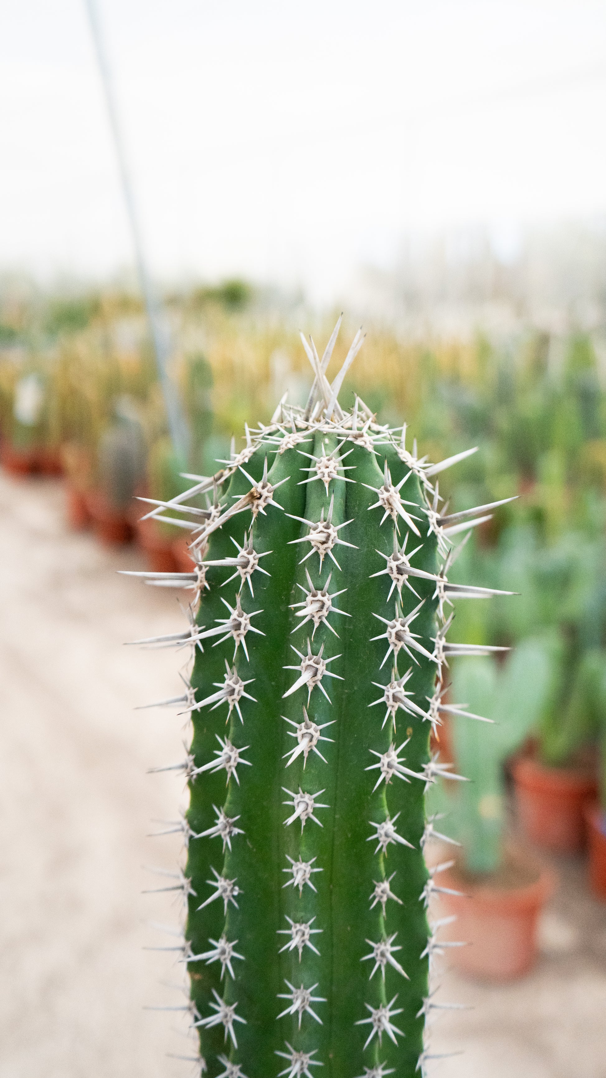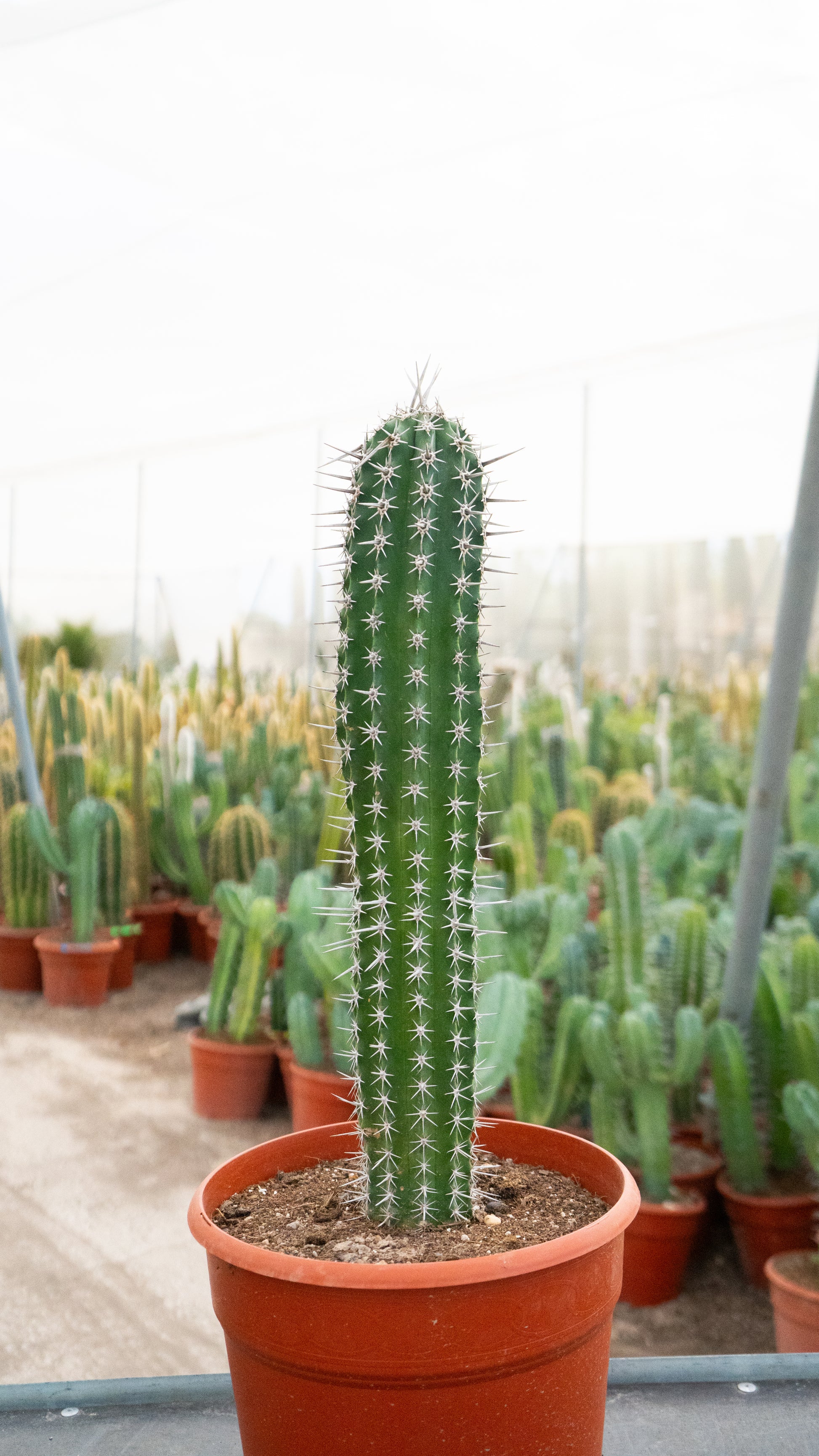 Este cactus columnar se destaca por sus tallos cubiertos de espinas plateadas y su altura, que puede alcanzar hasta 3 metros. Ideal para jardines soleados y climas áridos.