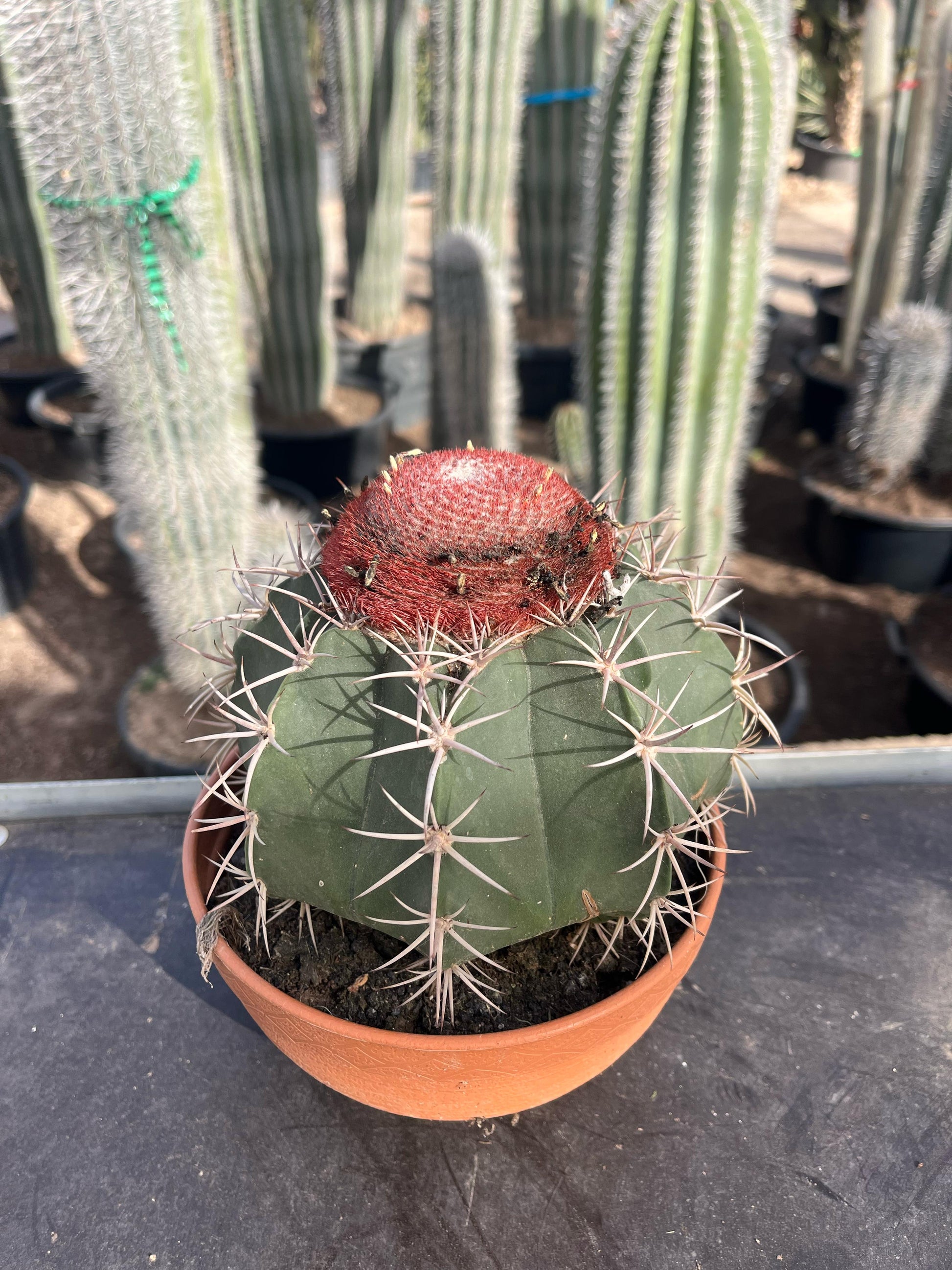 El Melocactus, o cactus melón, es una planta globosa que se caracteriza por su forma redondeada y su peculiar cefalio en la parte superior, donde florece y produce frutos.